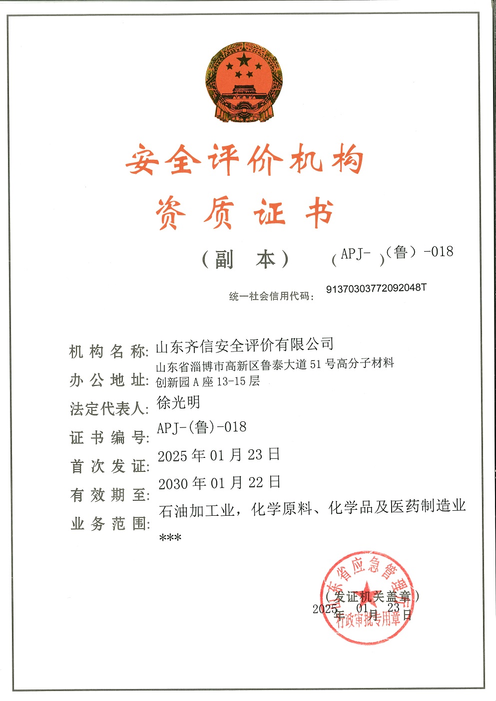山東齊信安全評(píng)價(jià)有限公司成立于2005年3月,注冊(cè)資本300萬元人民幣,固定資產(chǎn)總值804.8728萬元。法定代表人徐光明,注冊(cè)地址及辦公地址位于淄博高新區(qū)魯泰大道51號(hào)高分子材料創(chuàng)新園A座13-15樓。2005年9月取得安全評(píng)價(jià)機(jī)構(gòu)乙級(jí)資質(zhì)。自國(guó)家應(yīng)急部1號(hào)令實(shí)施以來,公司于2020年1月15日取得新安全評(píng)價(jià)資質(zhì),業(yè)務(wù)范圍包括:陸上油氣管道運(yùn)輸業(yè);石油加工業(yè),化學(xué)原料、化學(xué)品及醫(yī)藥制造業(yè);金屬冶煉。2018年12月21日取得安全生產(chǎn)標(biāo)準(zhǔn)化二級(jí)評(píng)審單位,評(píng)審范圍:危險(xiǎn)化學(xué)品、紡織、建材、輕工、冶金、機(jī)械。              公司現(xiàn)有人員41人,其中專職安全評(píng)價(jià)師37人,注冊(cè)安全工程師26人,研究員1人、碩士5人、雙學(xué)士1人,山東省安全專家?guī)鞂<?人、教授級(jí)高工1人,高級(jí)工程師8人、工程師22人,專職危險(xiǎn)化學(xué)品標(biāo)準(zhǔn)化評(píng)審員、工商貿(mào)標(biāo)準(zhǔn)化評(píng)審員30人,本科以上學(xué)